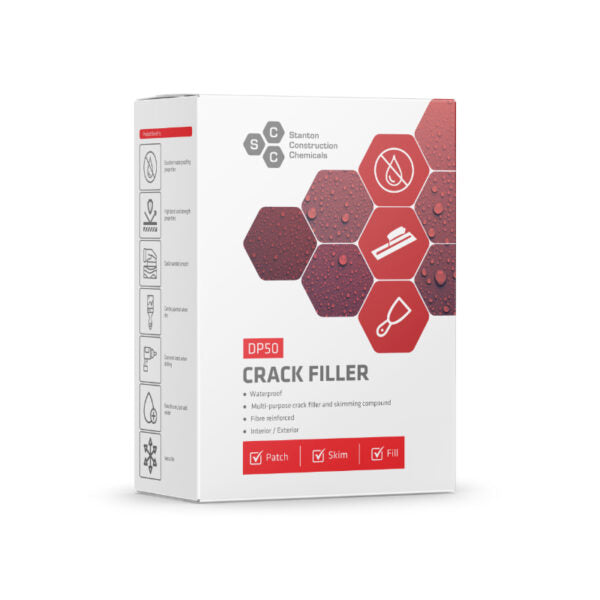 DP50 Waterproof Crack Filler is an off-white cement-based product designed with anti-slump properties for filling, sealing and waterproofing cracks, small holes and indentations on various substrates.